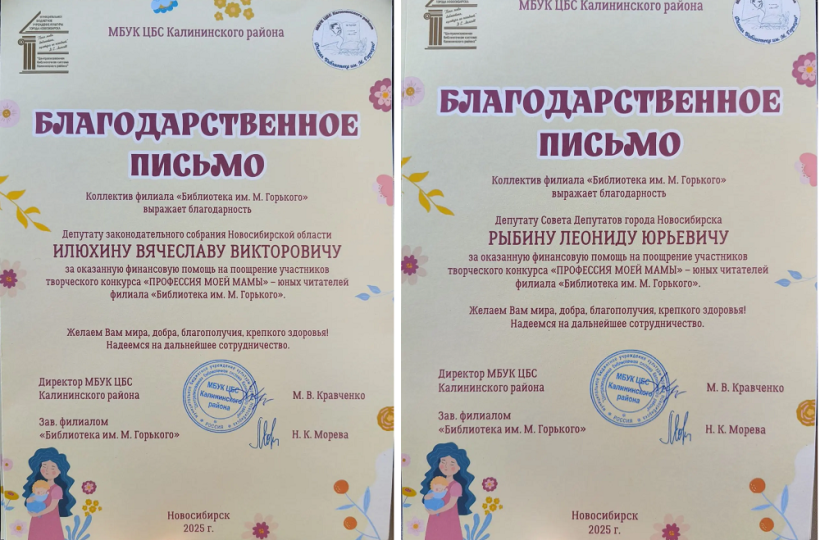 Коллектив библиотеки им. М. Горького вручил благодарственные письма депутату Законодательного Собрания Вячеславу Илюхину и депутату Совета депутатов г. Новосибирска Леониду Рыбину благодарственные письма за помощь в проведении конкурса.