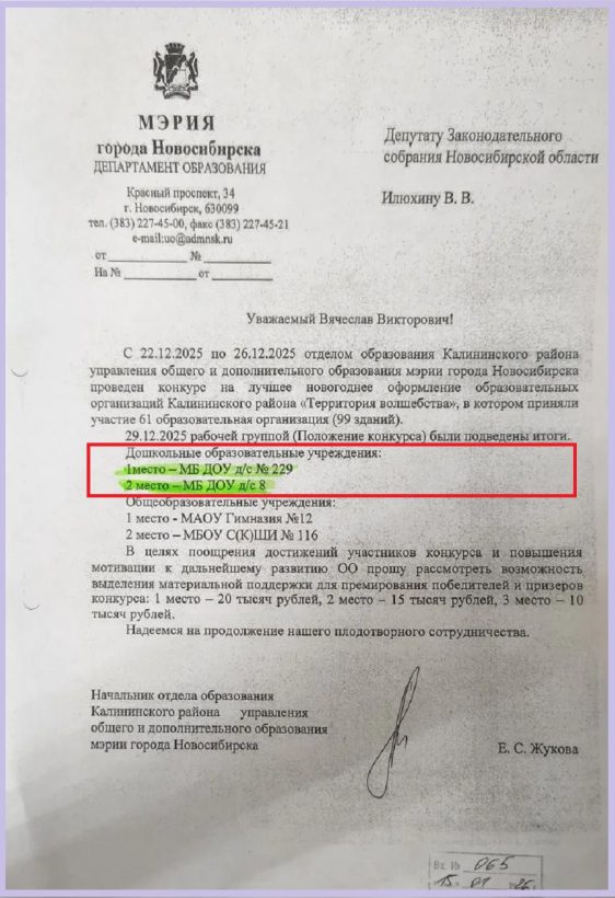 Отдел образования Калининского района обратился к депутату Законодательного Собрания Новосибирской области Вячеславу Илюхину с просьбой о поощрении победителей конкурса.